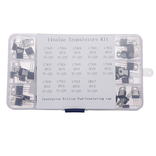 14 values: L7805, L7806, L7808, L7809, L7812, L7815, L7824, L7905, L7906, L7908, L7909, L7912, L7915, LM317 (each value 5pcs)